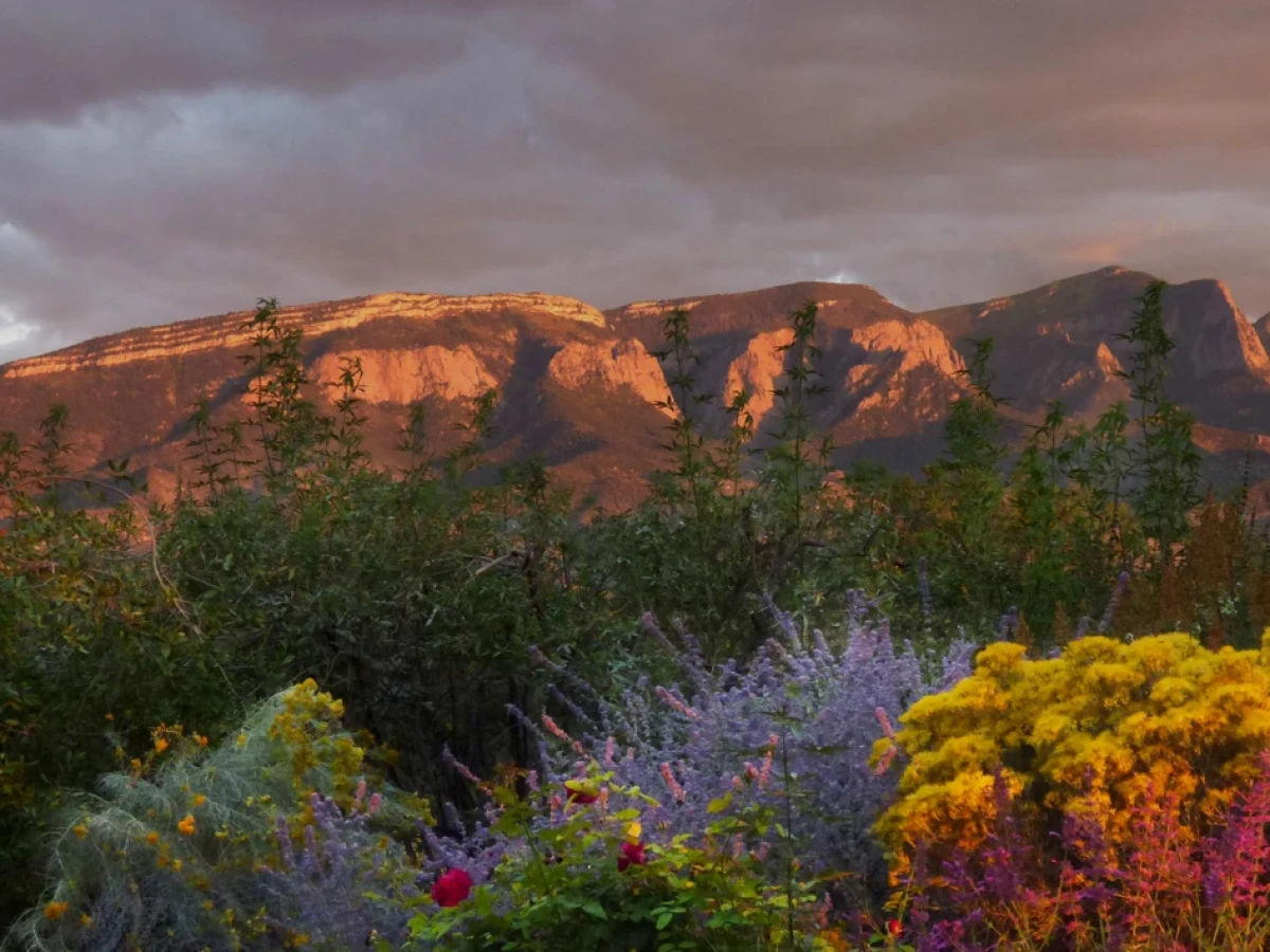 The scene above interrupted our dinner one recent evening, the sunset glow too beautiful to do anything but stare. We stopped eating and simply looked. Long golden rays kissed the tips of chamisa and rose and wild hyssop and Russian sage in our garden while at the same moment lighting up the Sandia Mountains a few miles away.